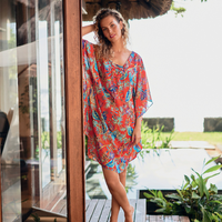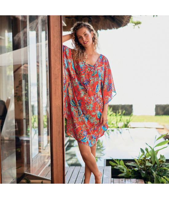 De poncho-achtige tuniek Atlanta laat de kleurrijke bladprint mooi uitkomen. Het moderne oversized model omvat speels en zacht uw figuur en zorgt voor verleidelijke accenten met een mooie vormende rand en een koordje bij de V-hals. Soepelvallend materiaal met oversized schouders met ¾-mouwen.