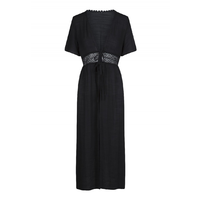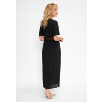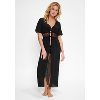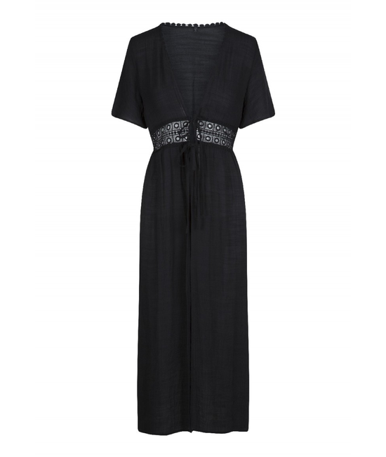 Deze lange kimono heeft korte mouwen en heeft rond de middel een gehaakt stuk. De kimono kan aan de voorkant gesloten worden doormiddel van een geknoopt touwtje.