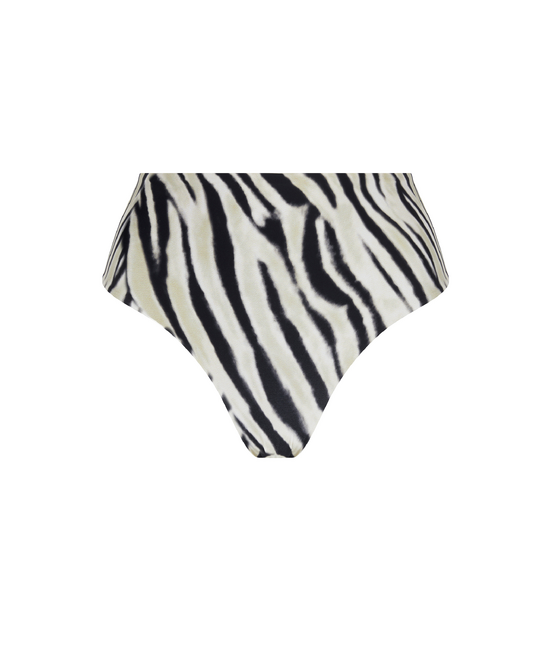 - Hoge tailleslip - Breed langs de zijkanten - Omkeerbare bikini slip, één kant in bedrukte maille de andere kant in uni maille. - Hoog te dragen in de taille of met omgeslagen tailleband.