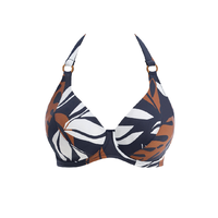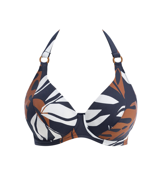 - Halter plungebikini (laag tussen de borsten) - Geen vulling - Met beugel - Diepe halsuitsnijding, met ringen (worden niet warm) - Grote print