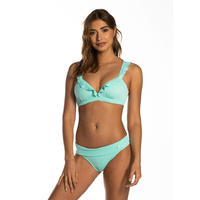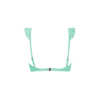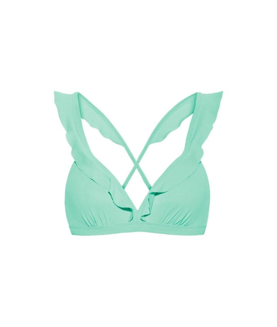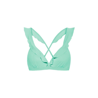 Beach Glass ruffle bikinitop met voorgevormde cups en beugel. De ruffles lopen van de schouderbandjes door over de cups. De top heeft verstelbare schouderbandjes en een metalen sluitclip op de rug.