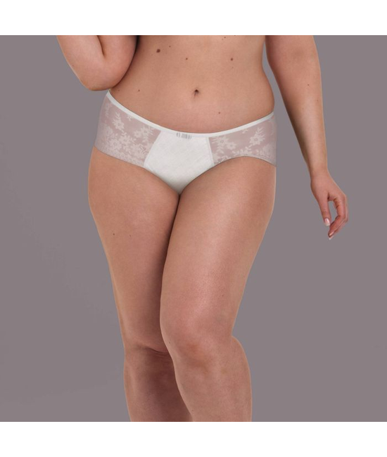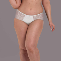 - Short - Voering met een ondoorzichtig ruitje - Doorzichtig kant bij de billen en de zijkanten - Geen elastiek maar een platte boord van kant - Snijdt niet in de huid - Tekent niet af onder strakke kleding