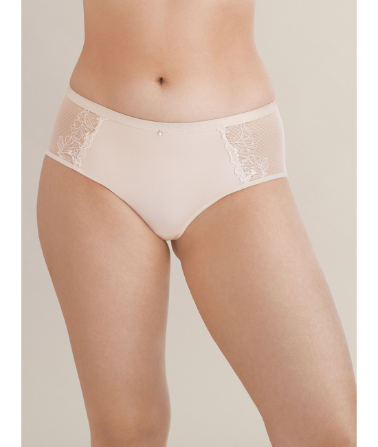 - Hoge short - Voor- en achterzijde niet transparant - Katoenen kruisje - Kant op de zijden