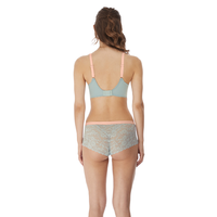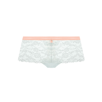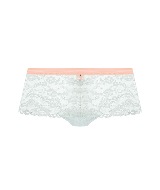 Gemaakt van zachte stretchkant voor een extra comfortabel gevoel. Voorzien van contrastgrijze details en een lintje met een zilveren drukknoopbedel. De short is niet blikdicht, maar heeft een gevoerd kruisje uit katoen.