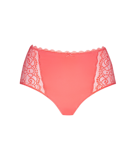 - Hoge slip - Kanten detail op de tailleband - Transparante kant aan de zijkanten - Platte, elastische zoom op been- en tailleband - Dichte stof op de billen