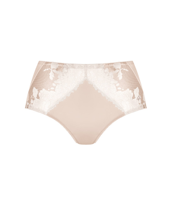 - Hoge slip - Kanten details voorzijde - Semi-transparante kant - Platte, elastische zoom op been- en tailleband - Dichte stof op de billen