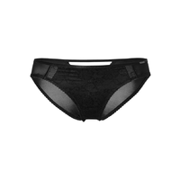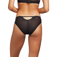Deze slip is aan de voorkant gemaakt van transparant kant met daaronder een ondoorschijnende stof. De stof op de heupen is van mesh. Het achterpand is ook van mesh en heeft een ovale opening onder de dunne heupband. In het midden is een klein ringetje aangebracht.