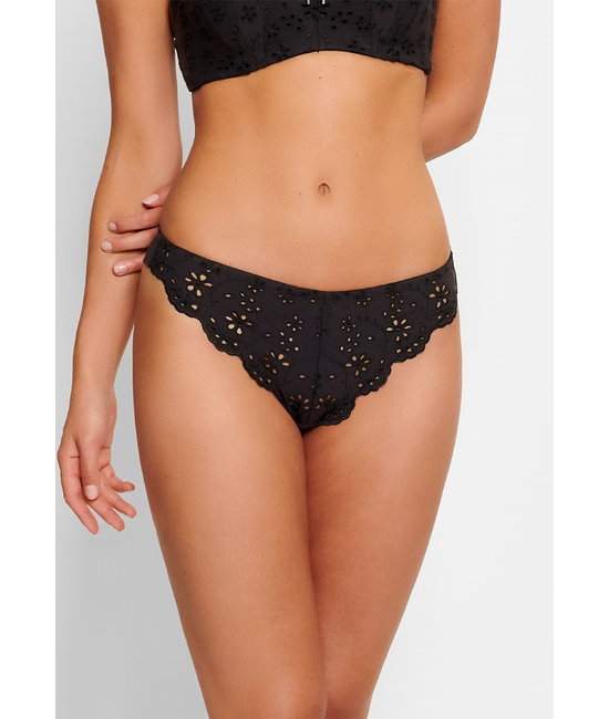 Agusti is een broderie serie in zwart katoen. De string heeft aan de voorzijde zwarte broderie. De achterzijde is egaal zwart en blikdicht. Het kruisje is gevoerd.