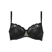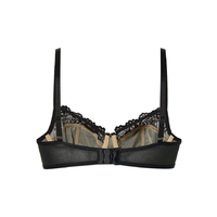 Deze beugel BH is niet voorgevormd. Het onderste deel van de cups is van een zwarte stof met glans en glitters. Het bovenste deel van de cups is van kant. De band is glanzend zwart.