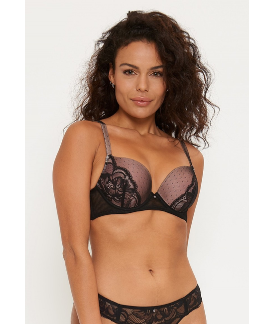 Vrouwelijk, romantisch. Deze geheel zwart kanten bh heeft voorgevormde cups in een mooie poeder kleur welke bedekt worden door het verfijnde zwarte kant. Deze gel bh is geschikt voor de kleinere borsten. Ook voor borsten die wat verder uit elkaar staan is deze gel bh de perfecte keuze! De gel bh geeft een natuurlijk push-up effect. De vloeibare gel kussentjes die veilig in de cups zitten geven precies daar de push, waar dat het meeste nodig is voor jou. Dit aangezien de gel in het kussentje kan bewegen en zich dus perfect kan aanpassen aan jouw borst. Op deze manier wordt een prachtig decolleté gecreëerd.