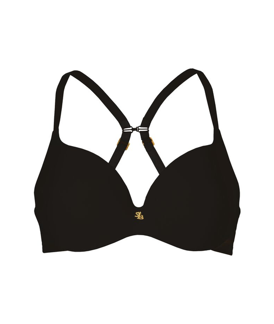 De Amelia lichte push-up bh heeft een zwart gestreept patroon over de gehele bh. De bandjes van de bh kan je gekruist dragen en langs je nek als een halter. Door de vorm van de bh is de bh niet te zien onder bijvoorbeeld een shirt. Ons model draagt een 75B bh en een maat M bottem.