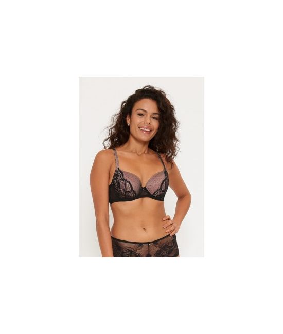 Vrouwelijk, romantisch. Deze geheel zwart kanten bh heeft voorgevormde cups in een mooie poeder kleur welke bedekt worden door het verfijnde zwarte kant.