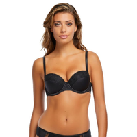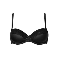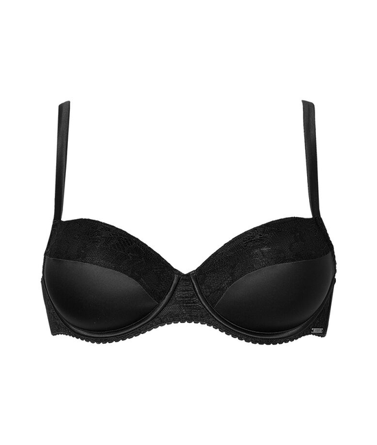 Deze voorgevormde beugel BH heeft cups van glanzende, glitterende stof. Het binnenste deel van de cups is van transparant zwart kant. De band is van dezelfde glanzende stof.