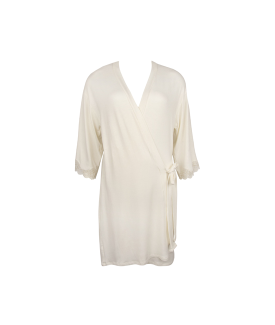 - Kamerjas half knie lengte - Gordel om te knopen - Kanten boordje onderaan de mouwen