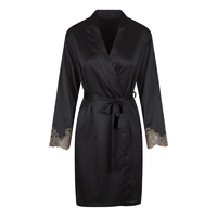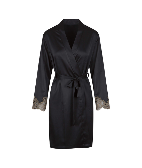 De kimono is afgewerkt met prachtige kanten details aan de mouwen uiteinden. De kimono is gemaakt van een zachte, satijnachtige stof en sluit met behulp van een ceintuur rond de middel.
