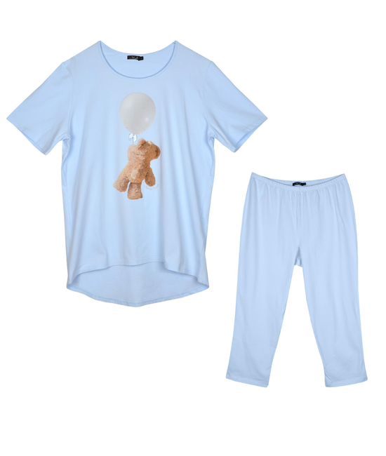 Blauwe katoenen t-shirt met berenprint en blauwe 3/4de legging.