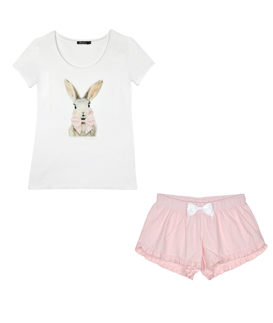 Witte katoenen t-shirt met konijnenprint. Short in geweven stof met franjes.