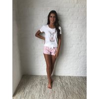 Witte katoenen t-shirt met konijnenprint. Roze short in geweven stof met franjes.