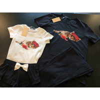 Witte katoenen t-shirt met poezenprint. Blauwe short in geweven stof met franjes.